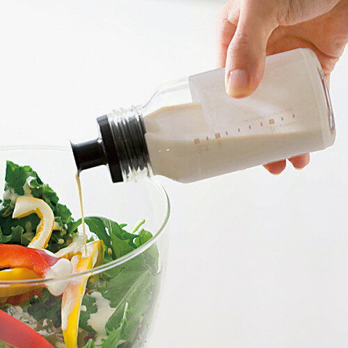 キャップの裏側が工夫されているので、材料の調味用を入れて思いっきり上下に振っても漏れないです👍